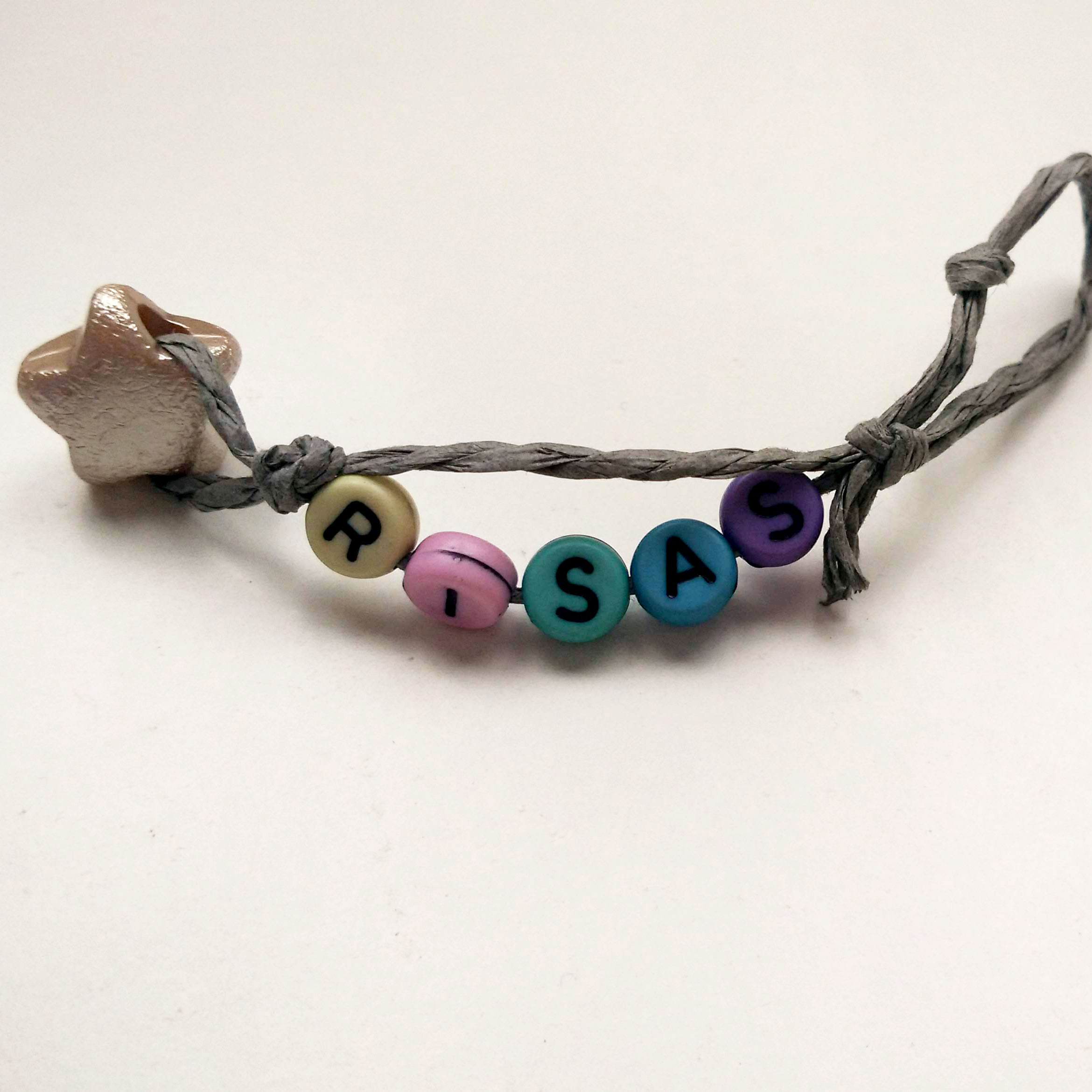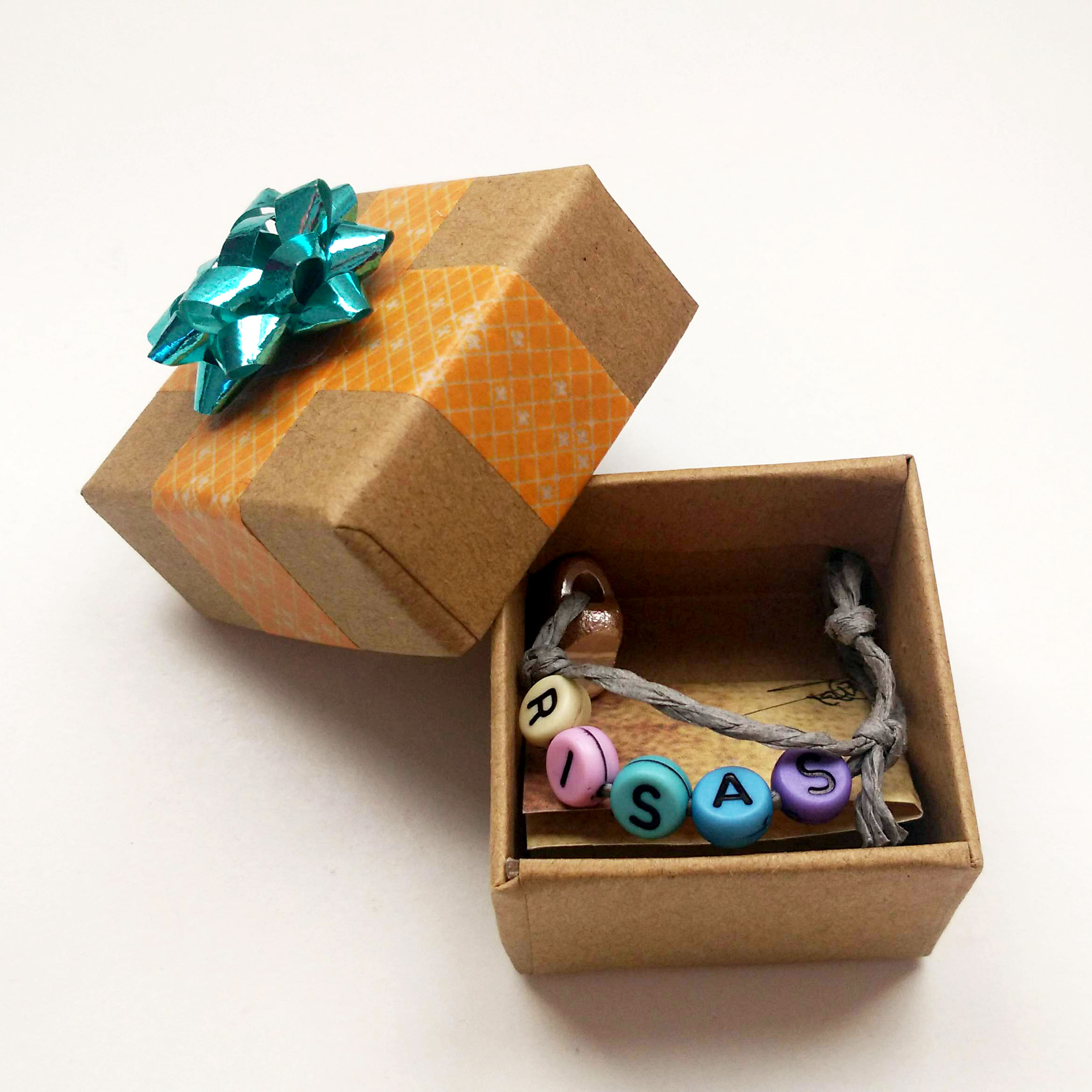 Llavero en cord贸n con mensaje motivacional de cuentas en caja regalo.